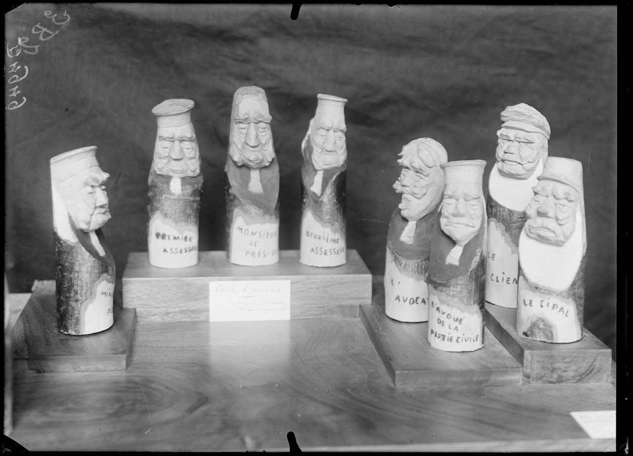 Paris, salon des Armées, Cour d’assises, scène de 13 personnages, bois sculpté au couteau par Hausseray.