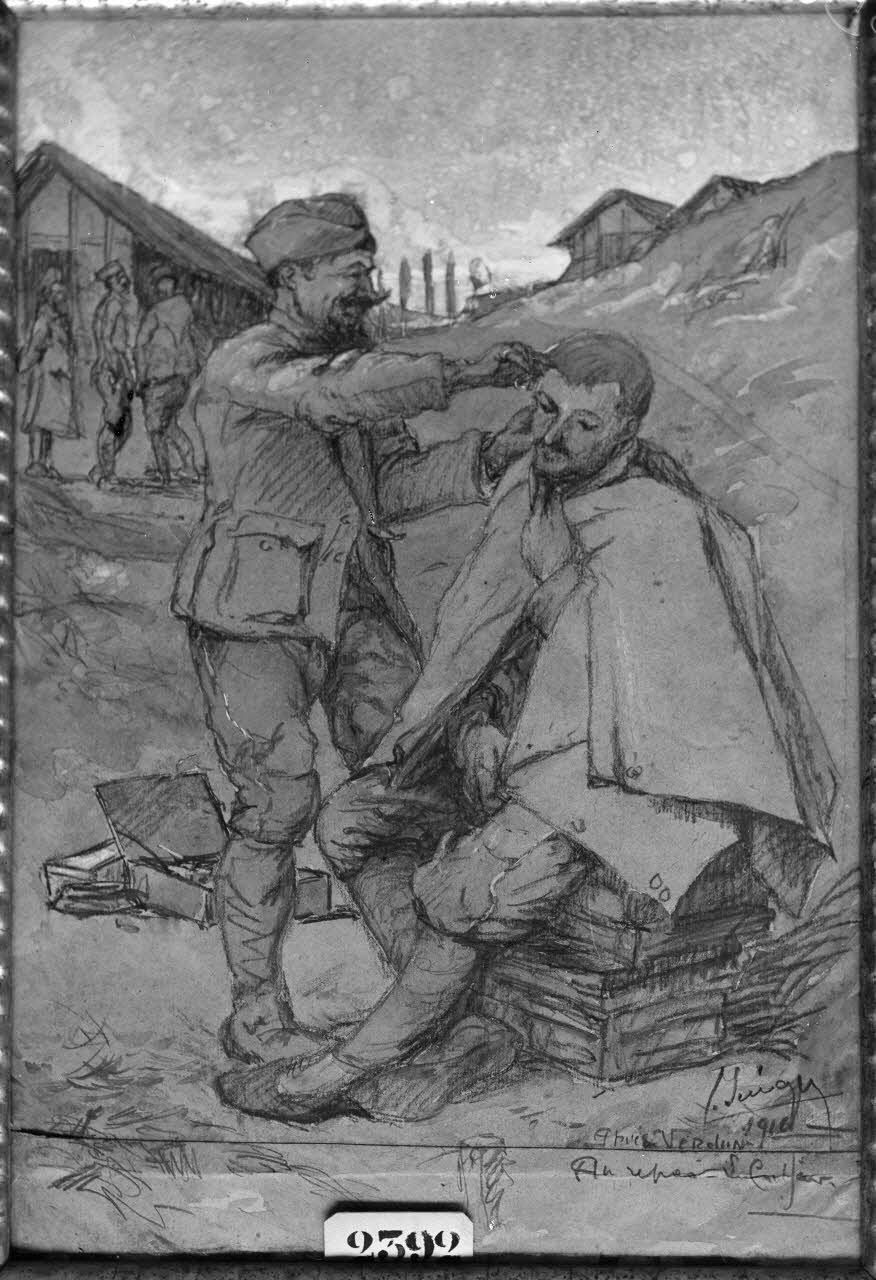 Paris, Salon des Armées, Le coiffeur de la compagnie, Seevagen. [légende d’origine]