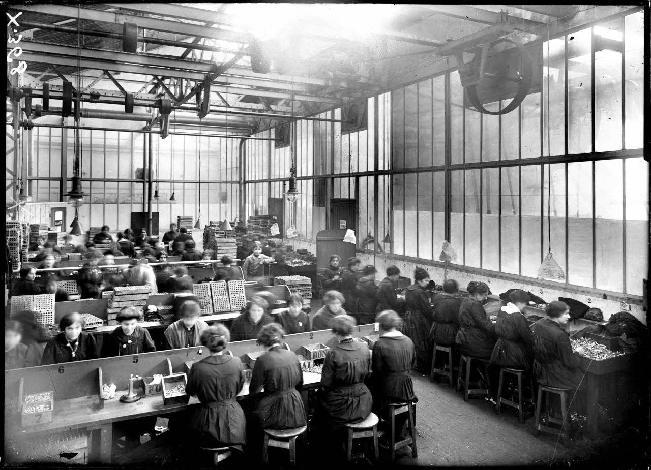 L'atelier de vérification des tubes porte-amorce pour canon de 75 mm où travaillent de nombreuses femmes.