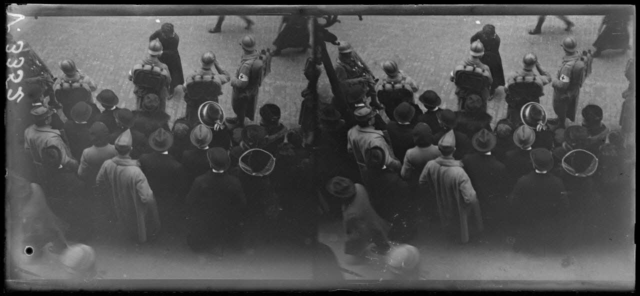 Paris, visite de S.M. le roi d'Italie. Derrière les soldats formant la haie, quelques spectateurs attendent le passage du cortège officiel.