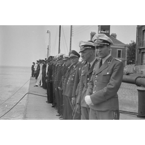 Sur le quai du port de Saint-Nazaire, des officiers de la Luftwaffe et de la Kriegsmarine lors de l'arrivée du sous-marin U-203.