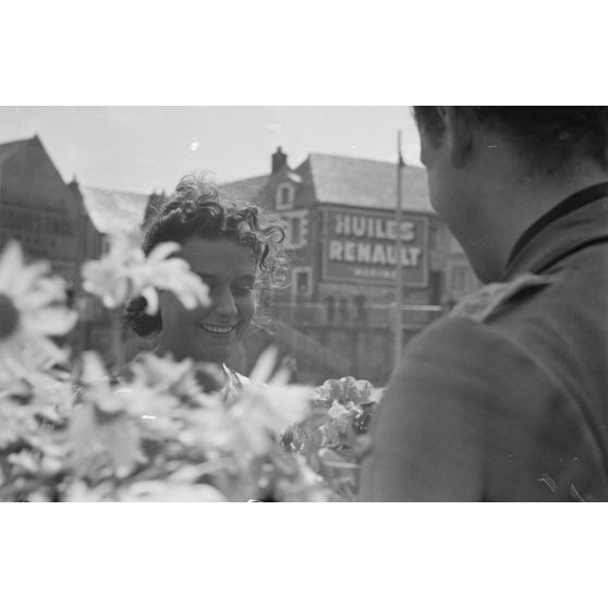Sur le quai du port de Saint-Nazaire, des officiers de la Kriegsmarine et des jeunes femmes lors de l'arrivée du sous-marin U-203.
