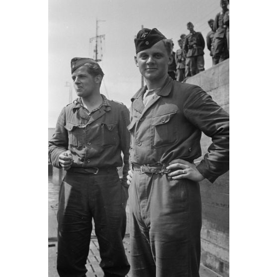 Portrait de sous-mariniers du U-203, lors de l'arrivée dans le port de Saint-Nazaire du sous-marin.
