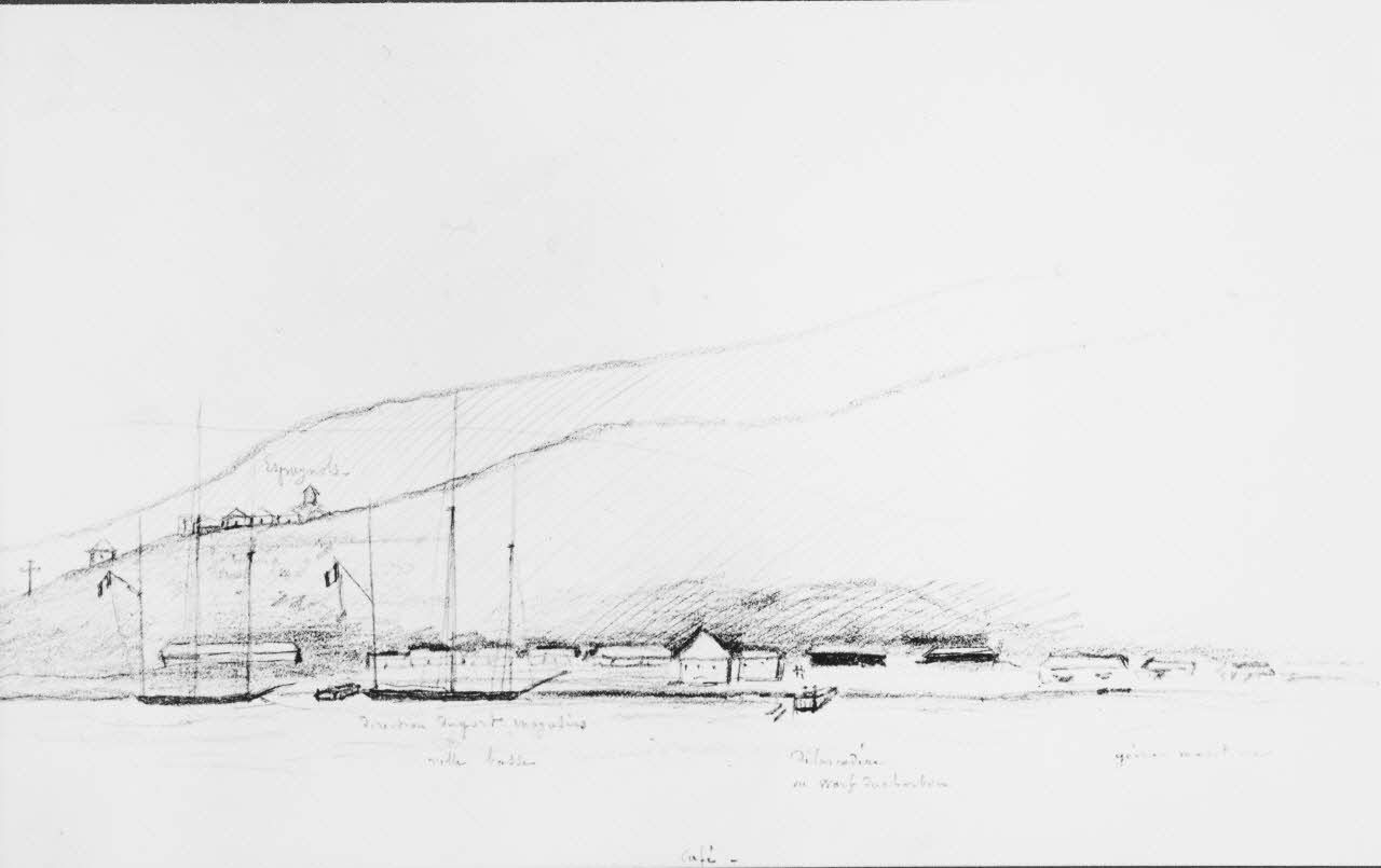Bâtiment devant la ville de Saint-Denis de la Réunion, le 4 juin 1858. Signé en bas à droite.