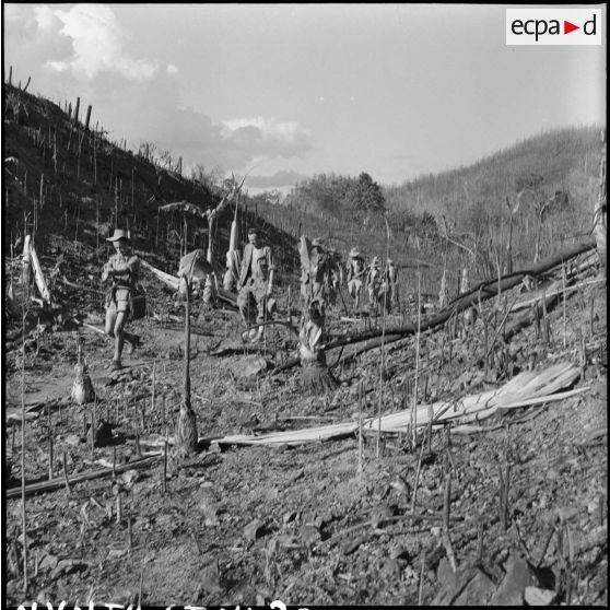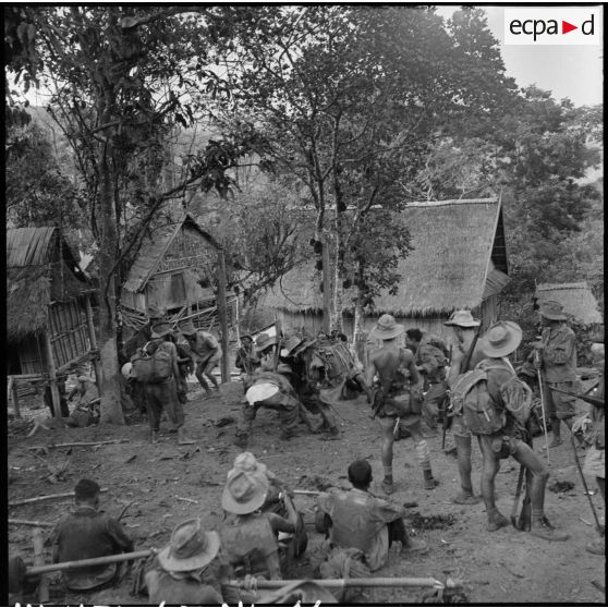 Des soldats de la colonne Godard traversent le village de Phu Teng lors de l'opération Condor.