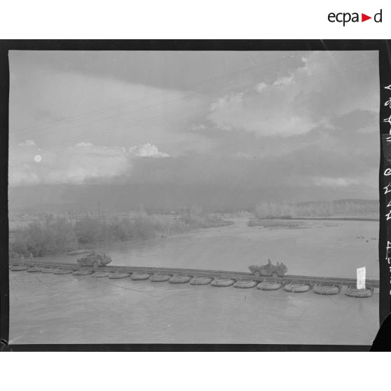 Passage de convois de scouts-cars et amphibies sur un pont de radeaux pneumatiques.