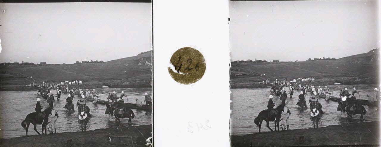 D68-42. Autour de Tananarive, les tirailleurs du 1er régiment de tirailleurs malgaches et les artilleurs de la 3e batterie du 7e régiment d'artillerie exécutent diverses manoeuvres. Ces évolutions sont destinées à apprécier la mobilité des batteries sur le terrain et à s'entraîner au tir. Le relief tourmenté, les cours d'eau et l'absence de routes praticables accentuent la difficulté des déploiements. Les rivières sont traversées à gué ou franchies sur d'étroites pirogues mises bout à bout. Deux types de canons de Bange de calibre de 80 mm sont alors utilisés : les canons de campagne, tirés par des attelages, et les canons de montagne, transportés en pièces détachées par des mulets. Les hommes sont équipés de mousquetons d'artillerie modèle 1892. Arrivés sur le champ de tir, les mulets sont déchargés et les pièces mises en batterie pour effectuer les exercices de tir.