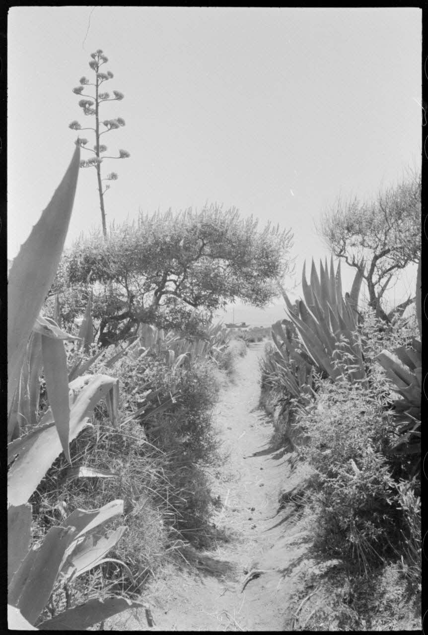 Paysage côtier sur l'île de Naxos, au premier plan des agaves en fleurs.