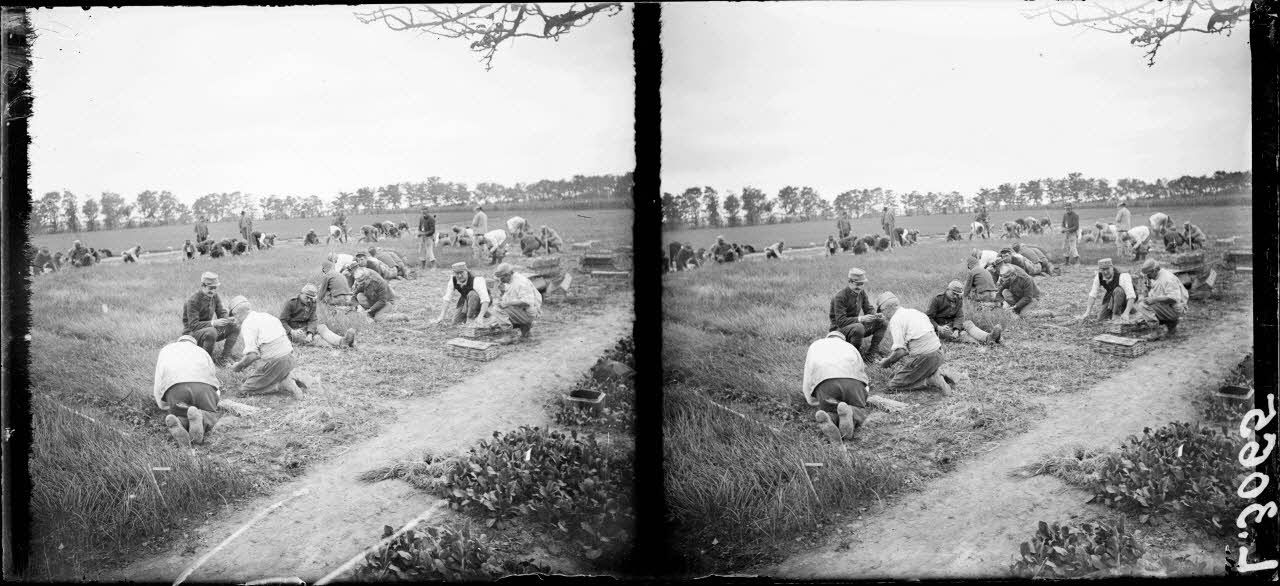 A la pépinière de Versailles : la cueillette et le chargement de légumes dans des camions pour l'expédition vers le front.