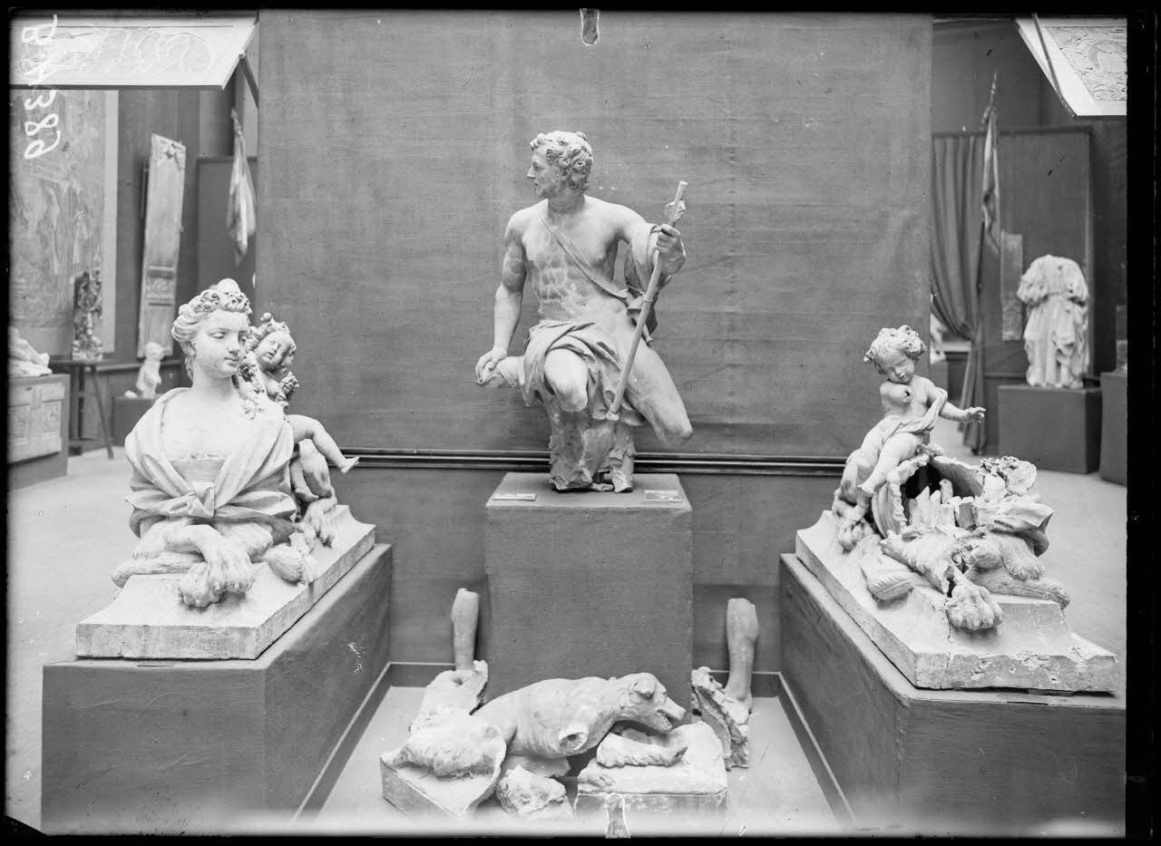 Petit Palais, exposition des œuvres d’arts mutilées, à gauche et à droite sphinx terre cuite, au centre, Acteon, terre cuite attribué à Couston provenant du parc du château à Vic/Aisne. [légende d’origine]
