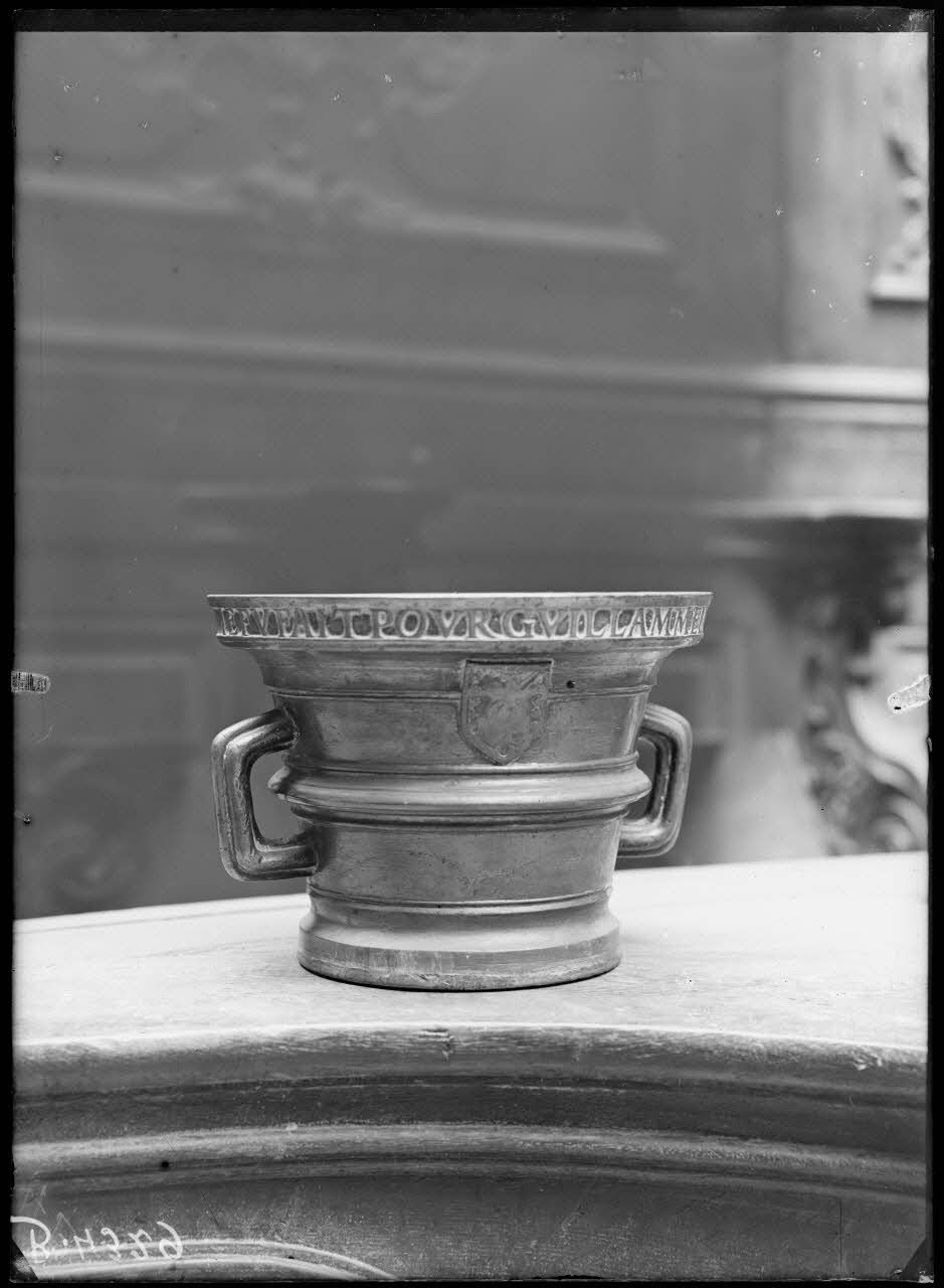 Petit Palais, exposition des œuvres d’arts mutilées, mortier de bronze daté de 1507 appartenant aux hospices de Verdun. [légende d’origine]