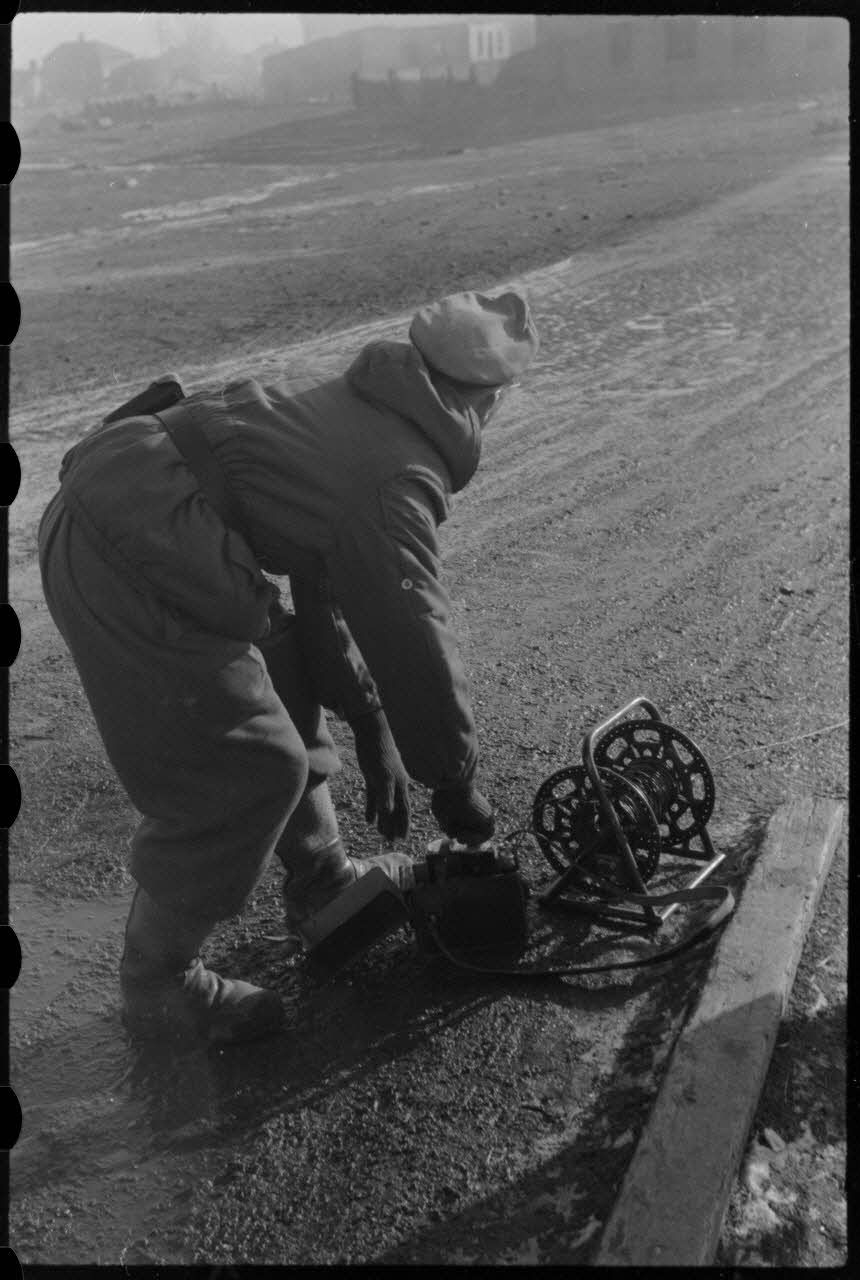 Peu avant le départ des troupes allemandes de Wjasma, un officier du Génie prépare la destruction d'un pont à l'aide d'explosifs.