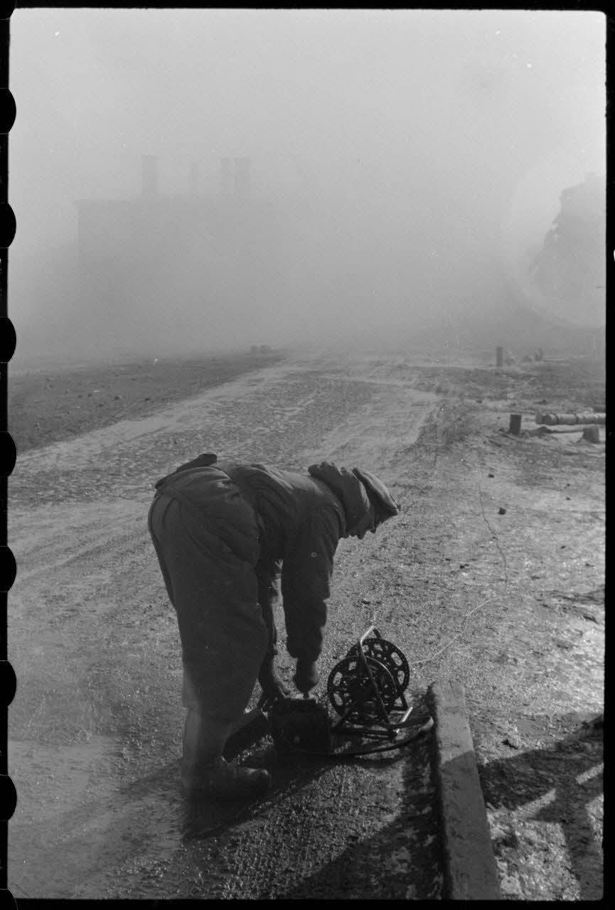 Peu avant le départ des troupes allemandes de Wjasma, un officier du Génie prépare la destruction d'un pont à l'aide d'explosifs.