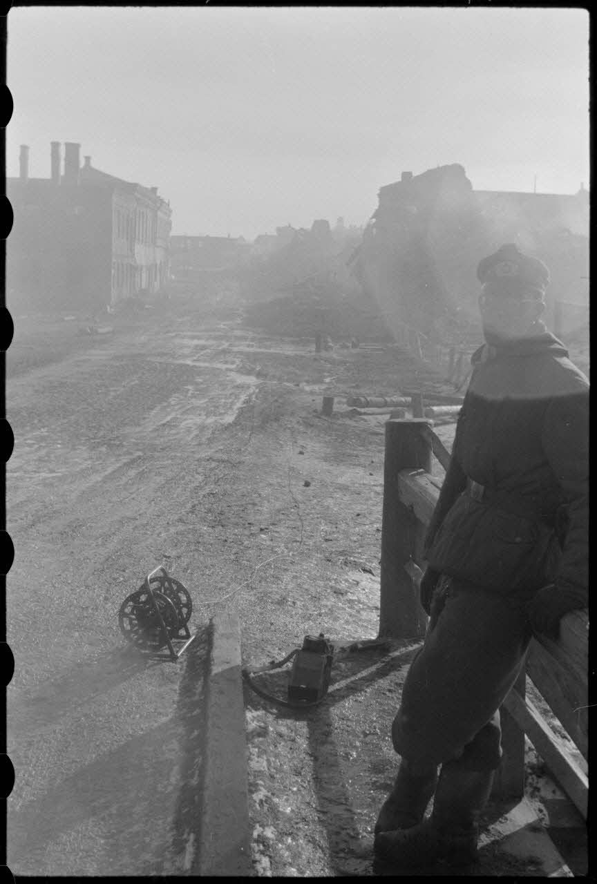 Peu avant le départ des troupes allemandes de Wjasma, un officier du Génie prépare la destruction d'un pont à l'aide d'explosifs.