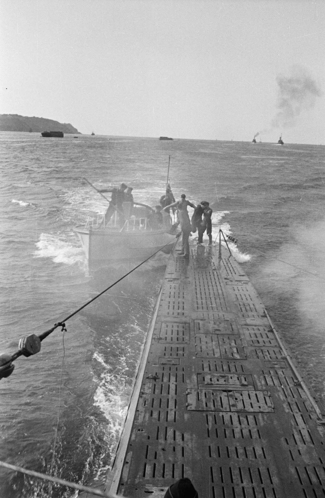 Peu avant le retour de croisière au port de Brest, un bateau se rapproche du U-boot U-203 pour y faire monter des marins.