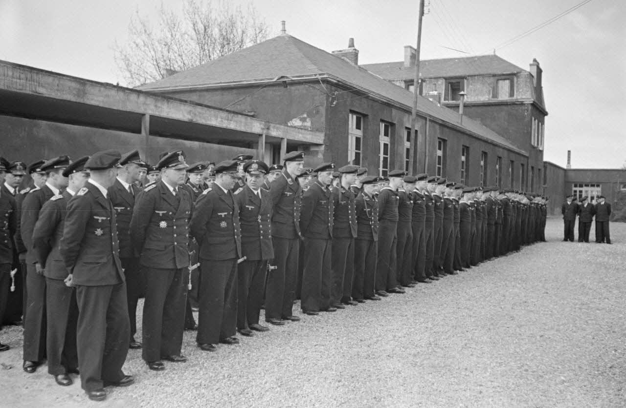 Peu avant une prise d'armes à Saint-Nazaire, des officiers et des sous-officiers de la marine allemande (Kriegsmarine).