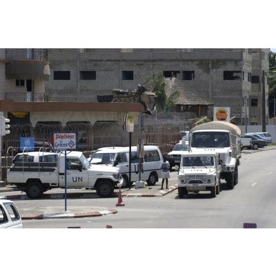 Véhicules de l'ONU (Organisation des Nations unies) stationnés en ville devant le camp de l'ONUCI (forces de l'ONU en Côte d'Ivoire).