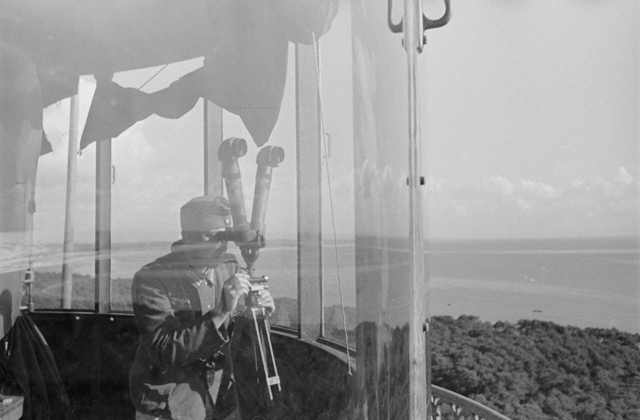 Le phare de la Courbe est utilisé par l'artillerie allemande comme un poste d'observation et comme un poste de direction de tir pour une batterie positionnée non loin du phare. Les canons de 15 cm sont mis en batterie dans des encuvements et camouflés par des filets. Un marin allemand discute avec un marin italien de la "Regia Marina".