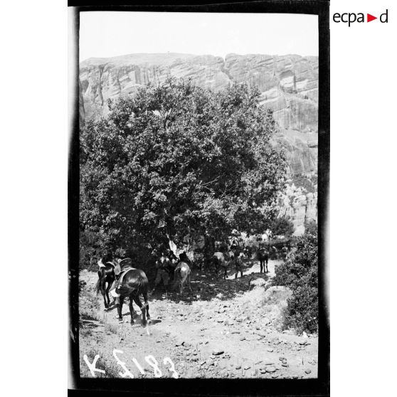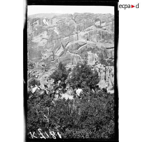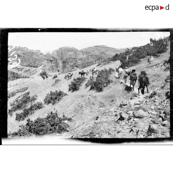 Météores (Théssalie). Les spahis de l'escorte du général Sarrail dans le sentier.