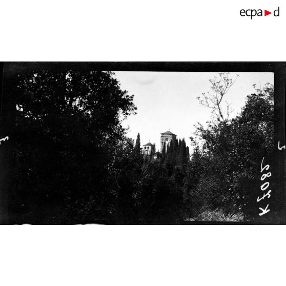 Météores (Théssalie). Couvent de Saint Etienne. Le général Sarrail, le colonel Dupertuis et le commandant de Langlade sur la terrasse du couvent.