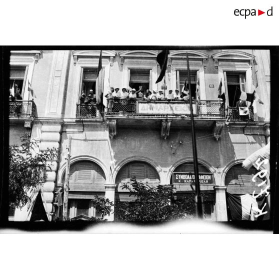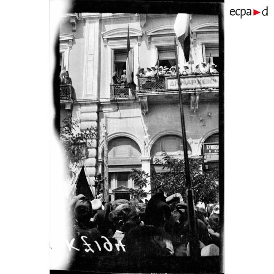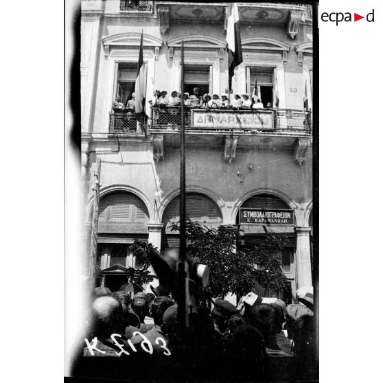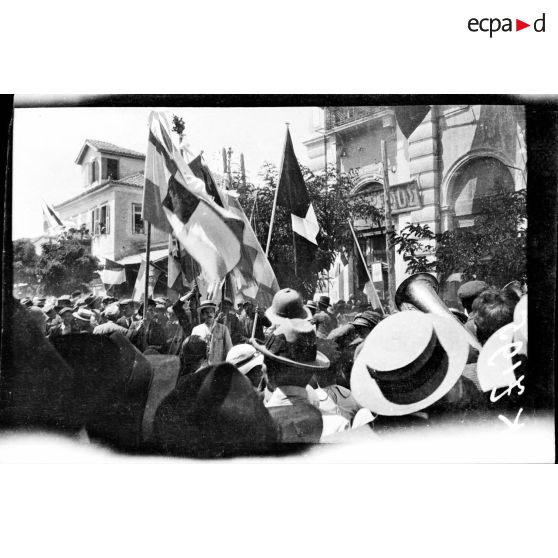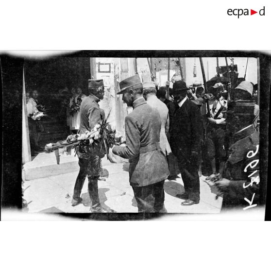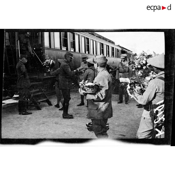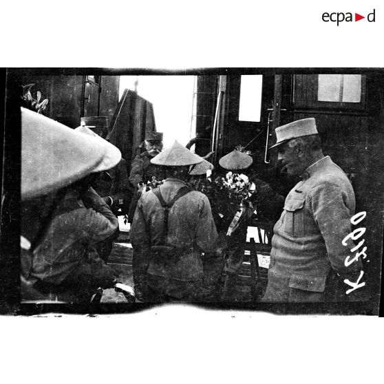 Gare de Larissa (Thessalie). Les annamites portant au wagon du général les fleurs qui lui ont été offertes.