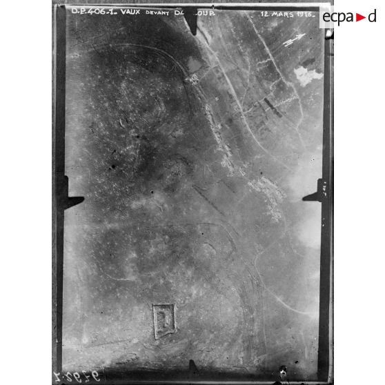Vue aérienne oblique de la région située au nord-ouest du fort de Douaumont. Au milieu d'innombrables entonnoirs creusés par les obus et remplis d'eau, on distingue les restes d'une tranchée.