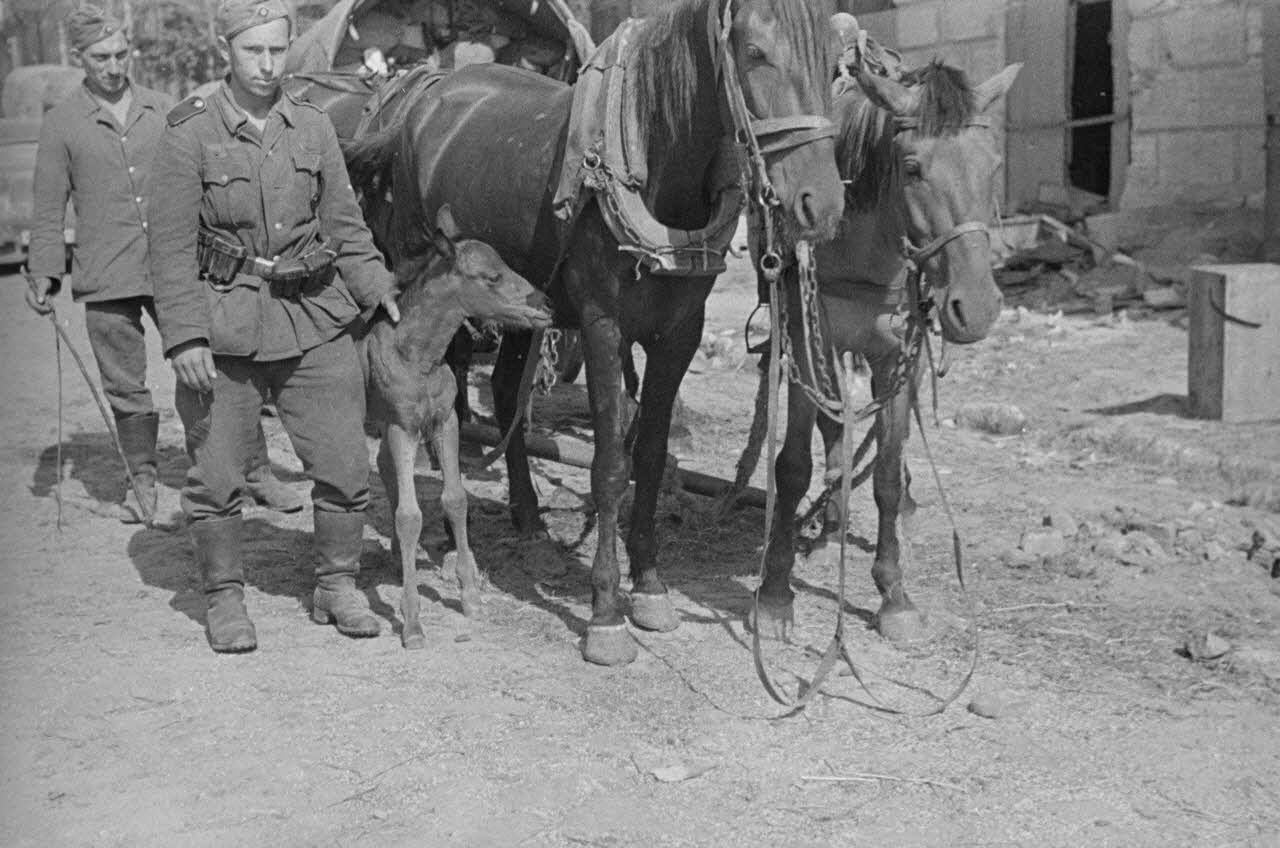 Photo de groupe avec le poulain, deux chevaux préparés pour tirer la charrette et deux soldats (dont celui avec le bâton).