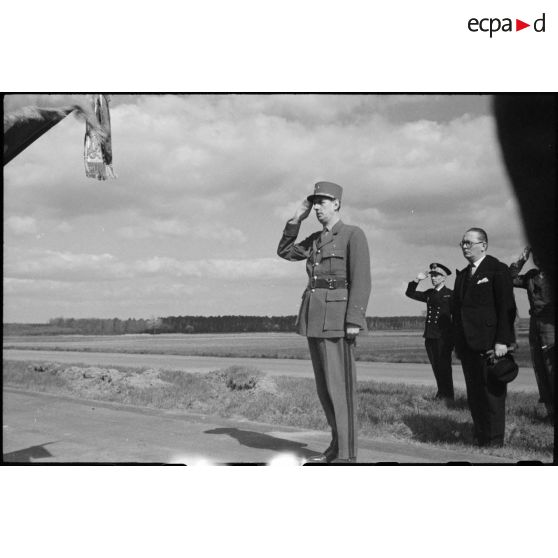 Le général de Gaulle salue le drapeau du 4e RTM pendant l'exécution de la Marseillaise.