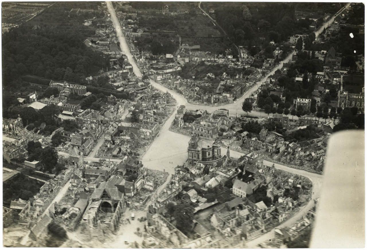 [Photographie aérienne d’une ville en ruine dévastée par les bombardements].