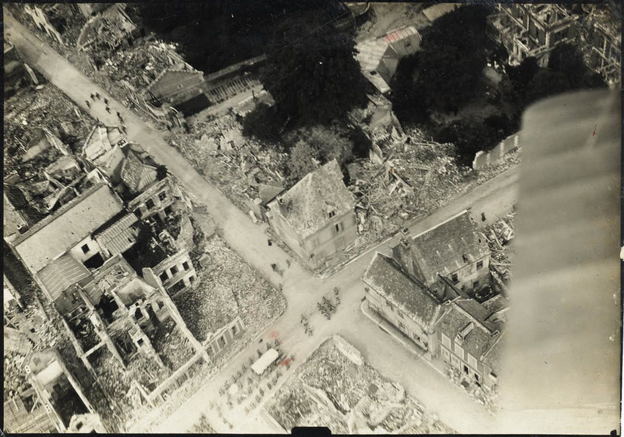 D169-16-17. [Photographie aérienne d’une ville en ruine dévastée par les bombardements].