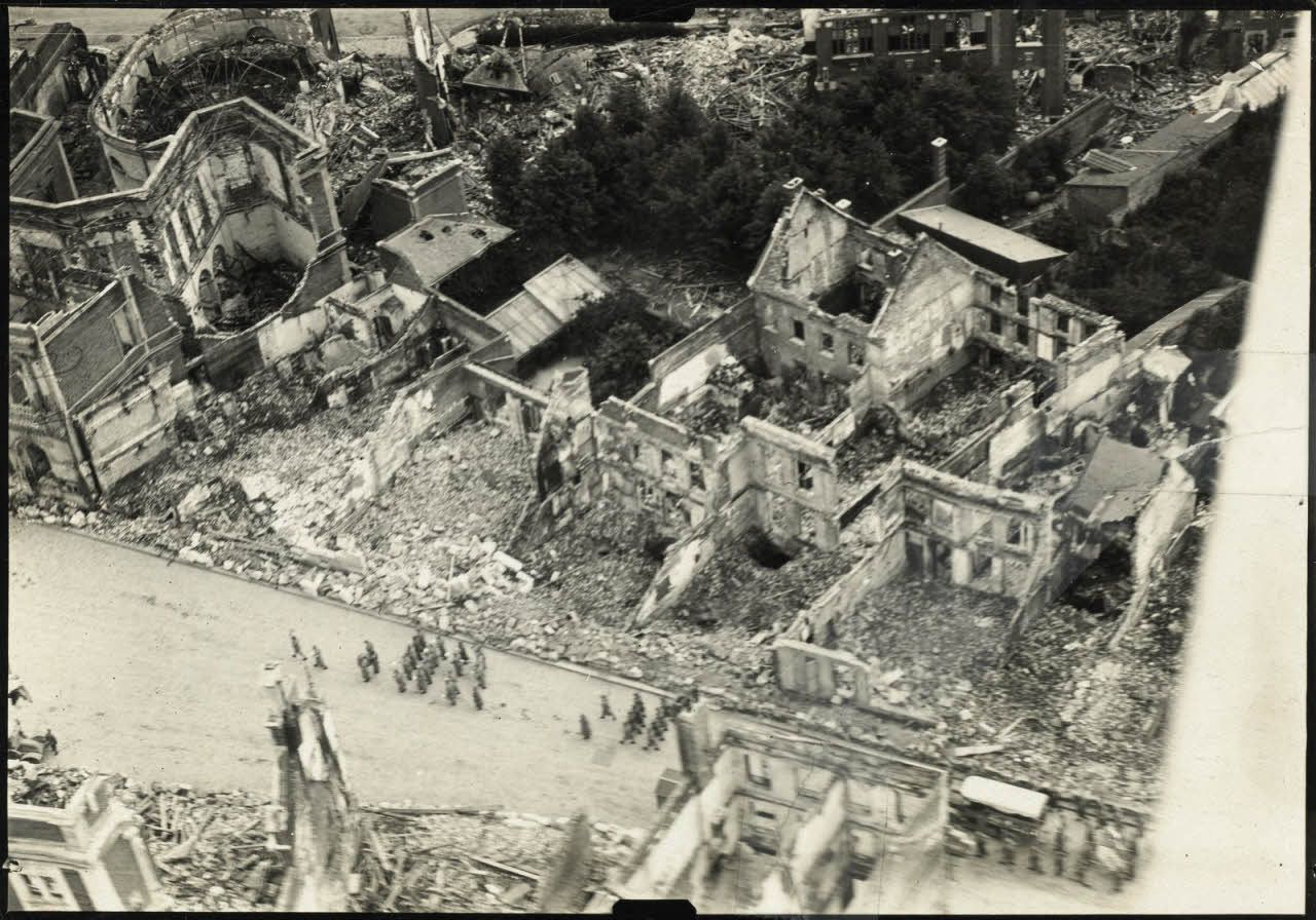D169-16-17. [Photographie aérienne d’une ville en ruine dévastée par les bombardements].