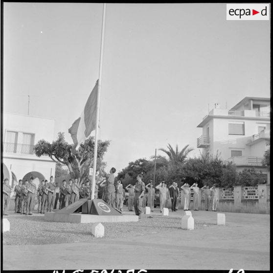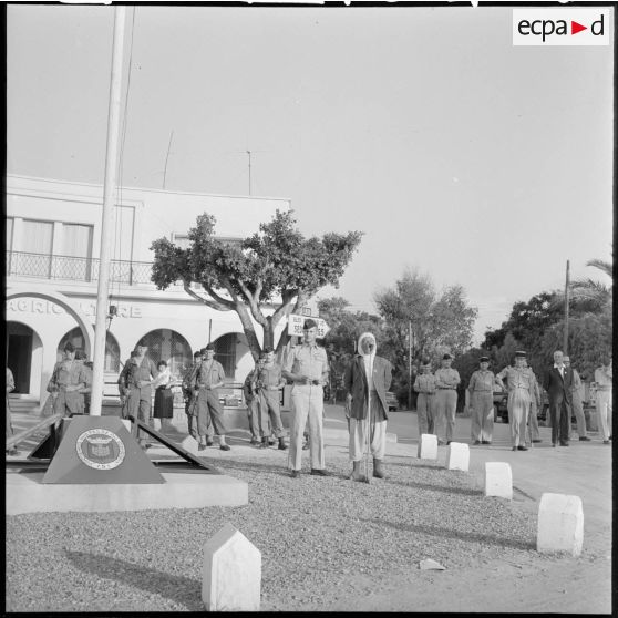 Cérémonie militaire devant la Maison de l'agriculture d'une petite ville.