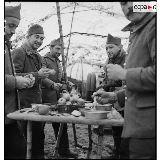 Artilleurs du 185e RAL attablés dans un abri de campagne.