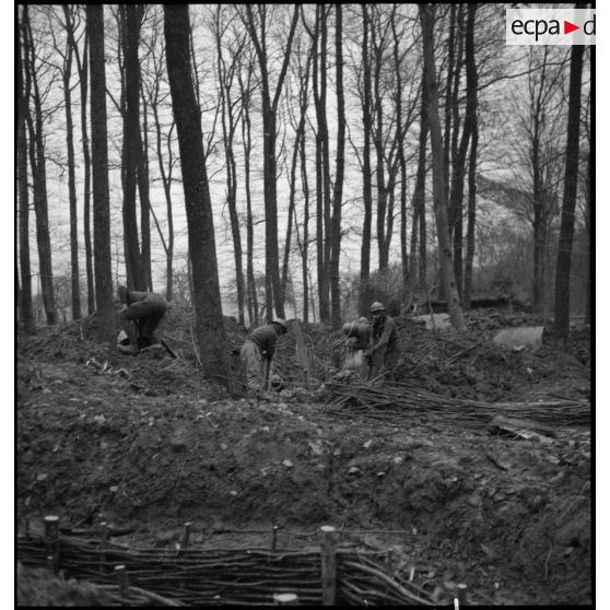Des soldats de la 4e armée aménagent un réseau de tranchées dans un bois.