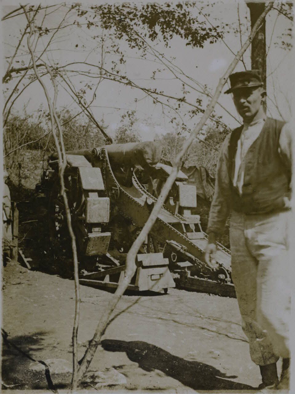 Les archives photographiques du médecin major Augarde (1869-1943), affecté au 138e régiment d''infanterie, sont caractéristiques de la production d''images fixes militaires pendant la Grande Guerre : portraits de militaires, pièces d''artillerie et mitrailleuses avec leurs servants, villages en ruine suite aux bombardements ennemis, abris de fortune aménagés dans des tranchées, etc. Les photographies cotées en D0349-005 étaient conditionnées dans une enveloppe intitulée « Divers ».