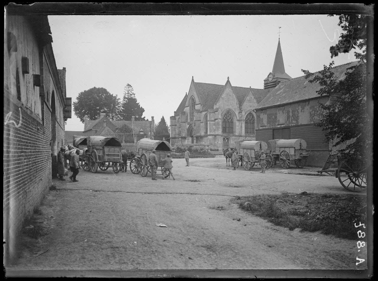 Piennes. Somme. Voitures de distribution sur la place de l'église. [légende d'origine]