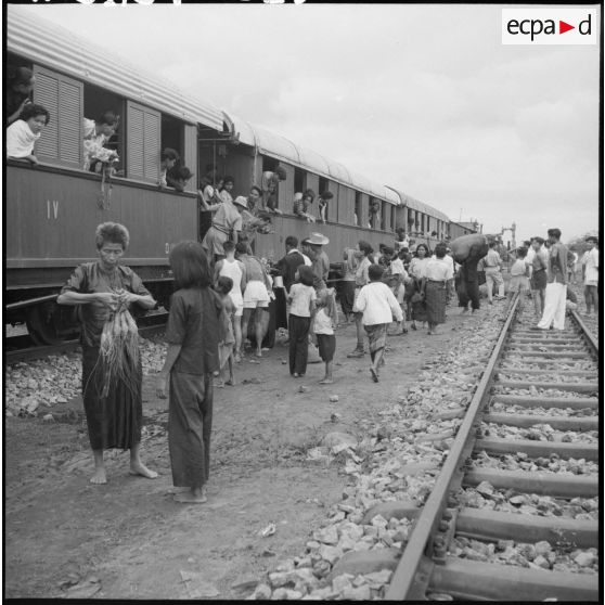 A contrevoie dans une gare pendent un arrêt sur une ligne de chemin de fer au Cambodge.
