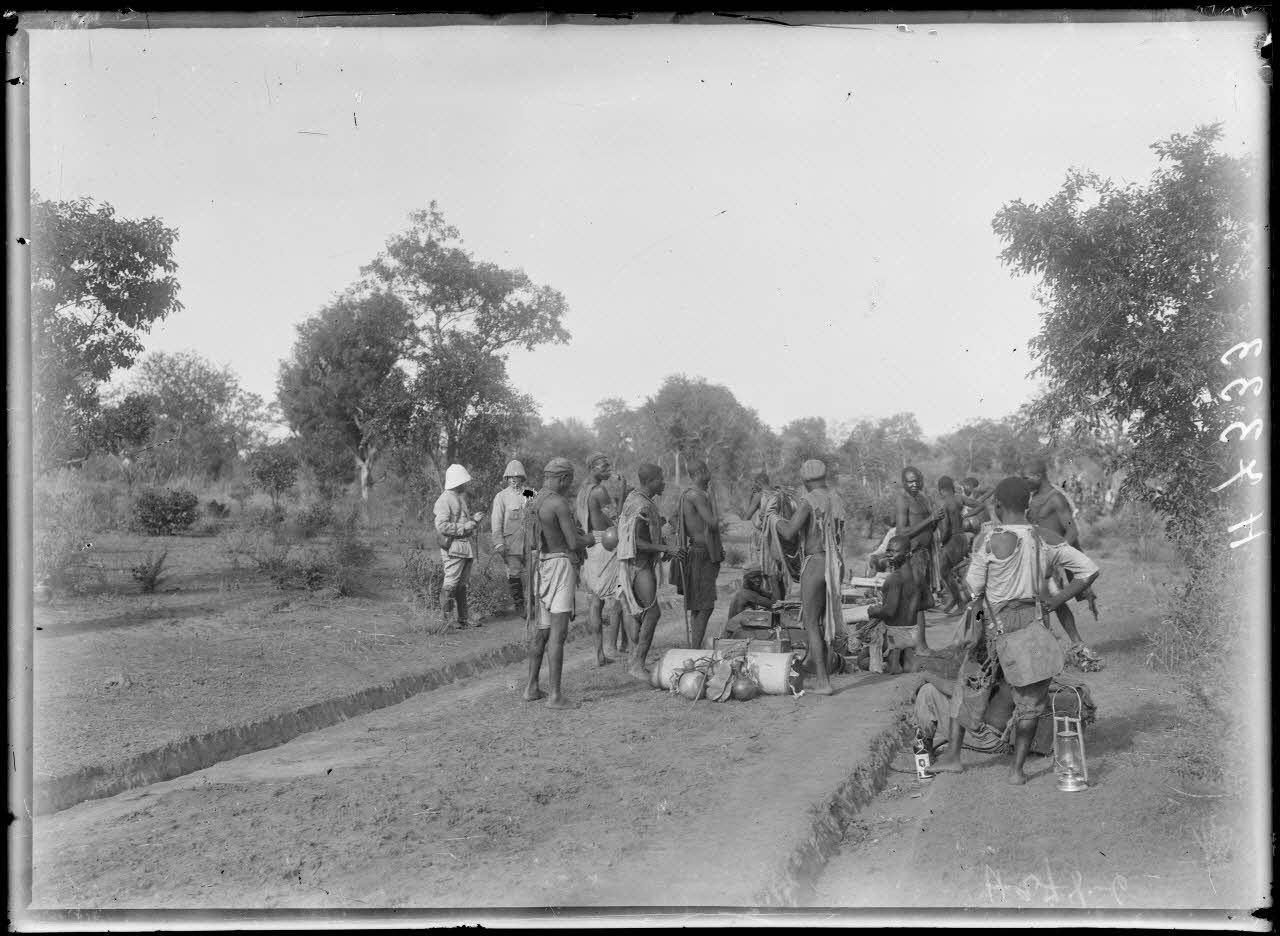 Piste de Garoua à Tschamba. Kalgé. Distribution de vivres aux porteurs.