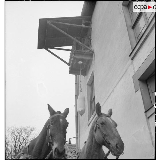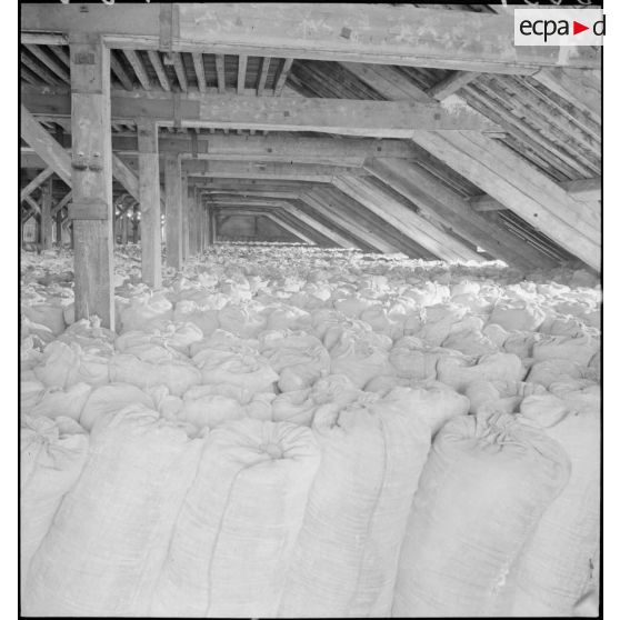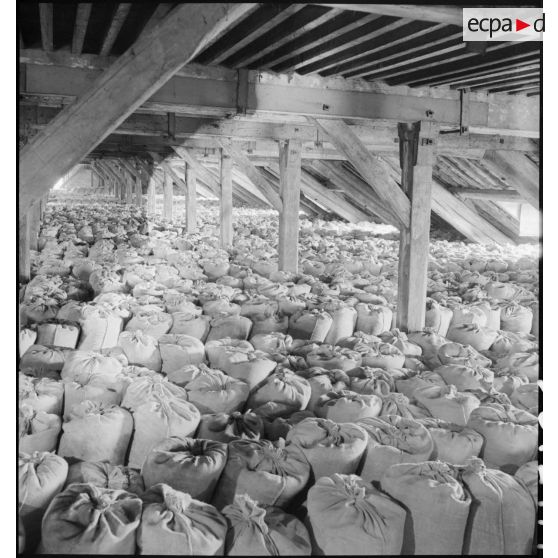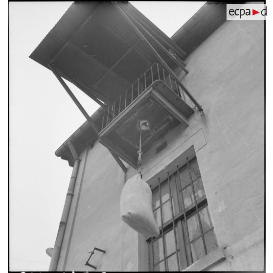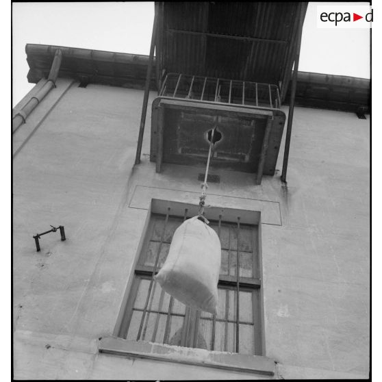 Des sacs de farine sont acheminés par un treuil extérieur dans les combles de la boulangerie militaire.