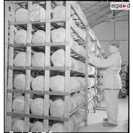 Des soldats rangent des pains cuits sur des étagères.