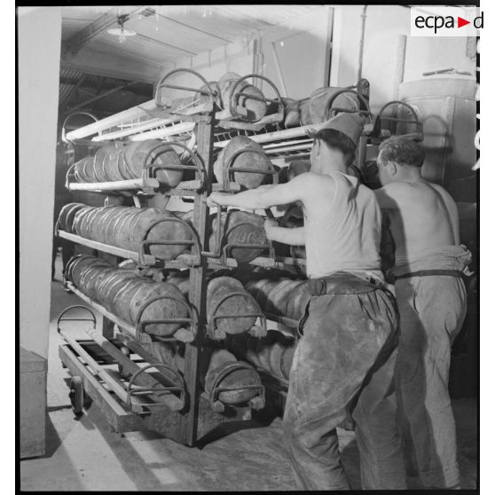 Des boulangers militaires sortent des pains du four et les rangent sur des étagères.