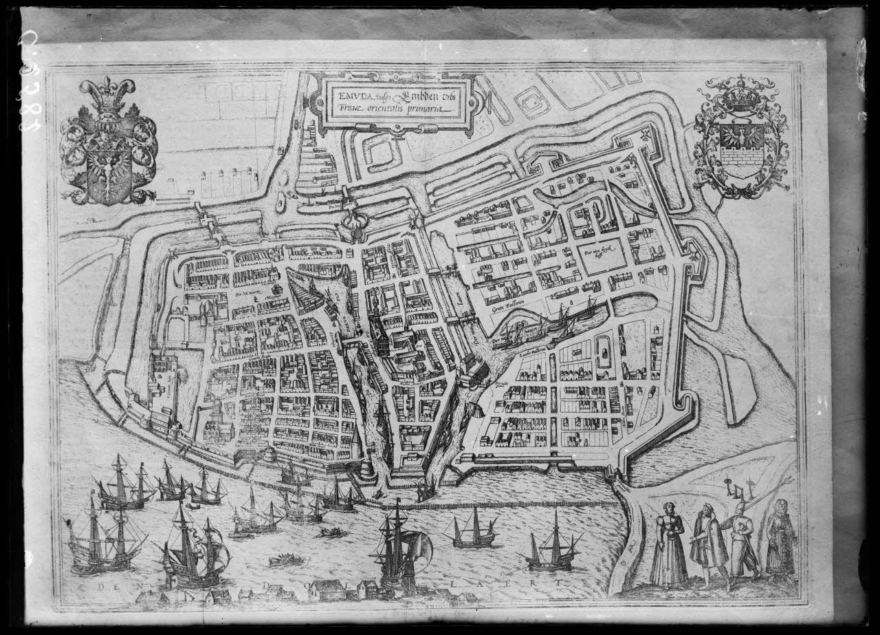 Note : cette vue plongeante vue du sud-ouest sur le Dollart montre Emden, qui est passé d'un comptoir commercial aux VIIe/VIIIe siècles à une ville à la fin du XIVe siècle et en 1536, le port fut agrandi. Sa population a atteint 15 000 personnes à la fin du XVIe siècle. L'Ems coulait directement sous les murs de la ville, mais son cours fut modifié au XVIIe siècle par la construction d'un canal. Emden a des canaux dans les limites de sa ville, caractéristique typique des villes néerlandaises, qui ont également permis l'extension du port. En 1595, Emden a été créée en tant que ville impériale libre sous la protection de la Hollande.