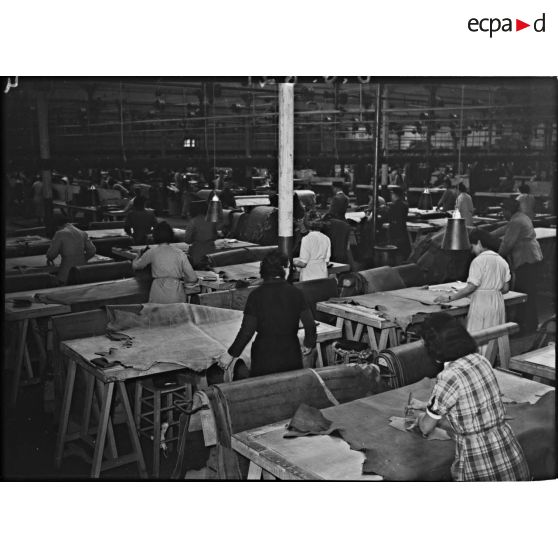 Plan général d'un atelier de découpe. Les ouvrières découpent des formes de chaussures sur des feuilles de cuir.