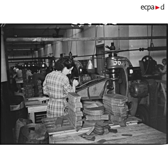 Des ouvrières découpent des semelles de cuir grâce à une machine.