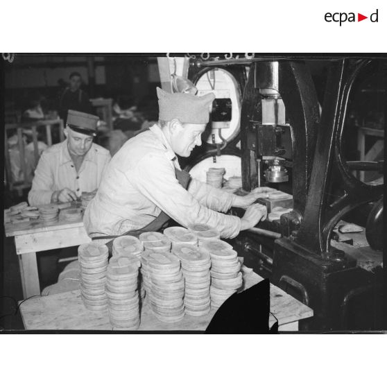 Des ouvrières découpent des lacets de cuir dans des ronds de cuir grâce à une machine.