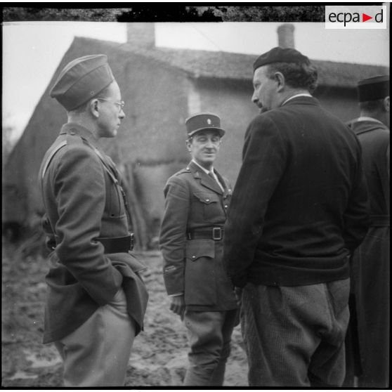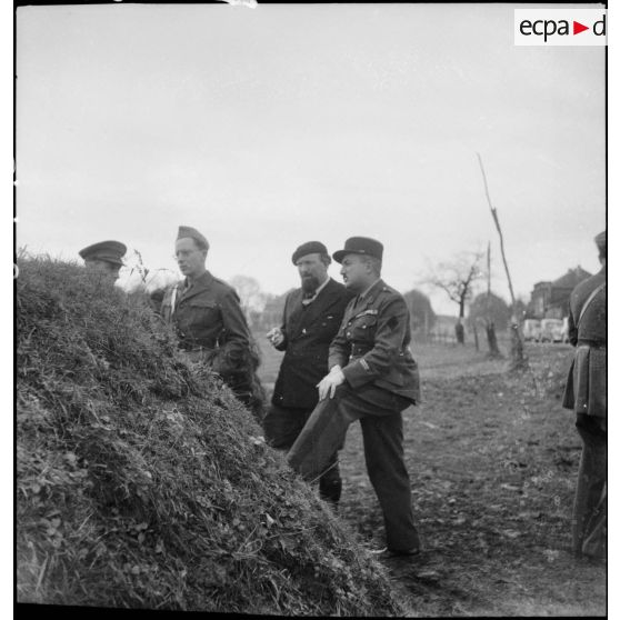 Des pilotes anglais, en compagnie du général d'armée Huntziger, viennent inspecter des carcasses d'avions allemands.