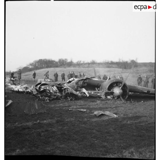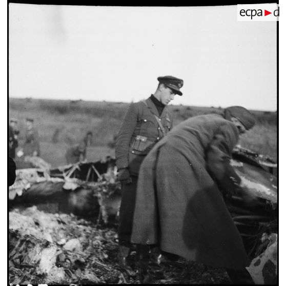 Des soldats de la 2e armée sont photographiés près des restes d'un chasseur Messerschmitt Bf-109.