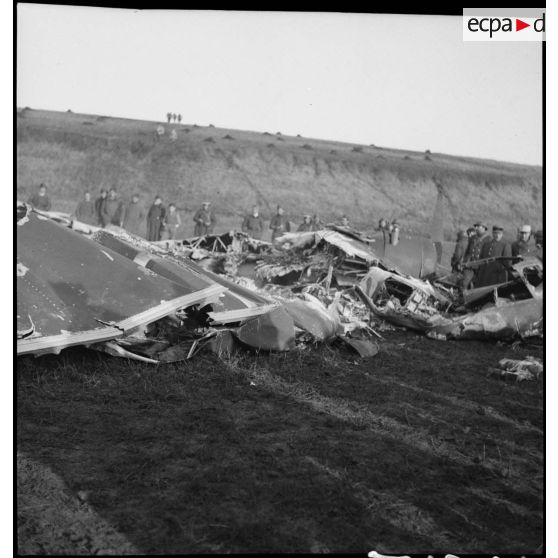 Plan général de personnels de l'armée de l'air qui inspectent l'épave d'un chasseur Messerschmitt Bf-109.