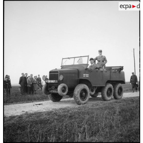Plan général de trois quarts avant d'un Laffly S15 R de la 2e DI à bord duquel se tient un général.