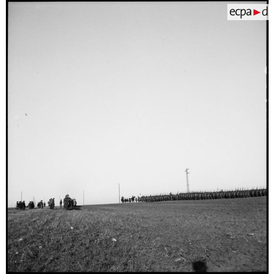 Des troupes alignées sont photographiées en plan général lors d'une prise d'armes au sein de la 2e DI.